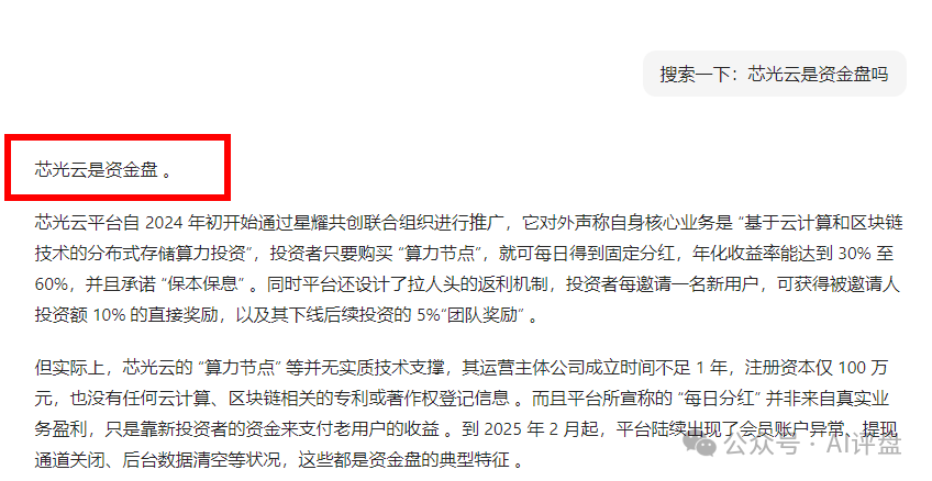 百度AI明确指出芯光云就是资金盘骗局,还是典型的,因为日收益0.4%-0.8%太高了,远高于正常投资。已经出现大量单割问题,全面崩盘也是可以预见的了!