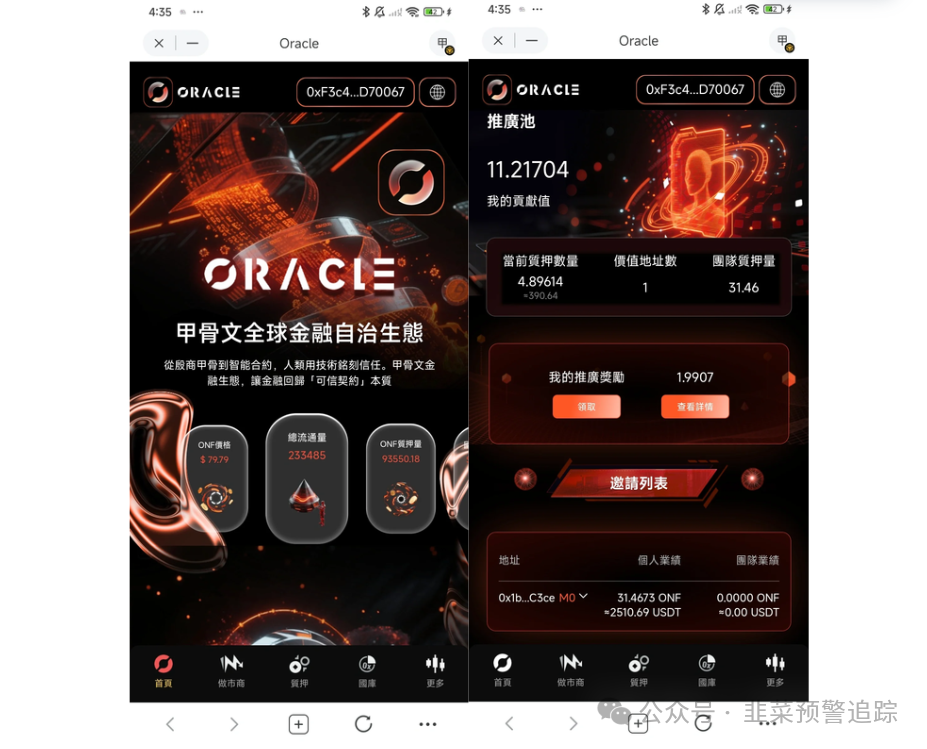甲骨文ORACLE推出ONF代币,让用户质押或买债券参与。设静态收益、动态推荐奖励与团队奖励,还有贡献值诱导持续投入,设30天锁定期。此活动未经监管批准,新用户不足时资金循环断裂,承诺回报成空。投入资金不受法律保护,维权难,很可能血本无归,务必远离!