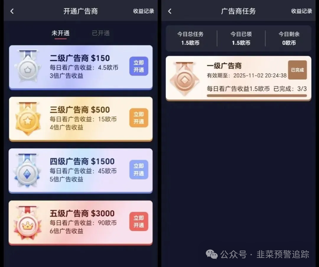 OBEY欧贝电商以注册、发朋友圈送U币吸引用户,降低其警惕性。设置不同广告商等级,承诺33天回本,违背市场规律。“欧币”价格固定上涨,是价格操控,营造稳赚假象。多层级奖励鼓励拉人头,本质为传销。该平台2025年8月28日开盘,9月6日就停止提现。其无真实盈利来源,资金链易断,现已崩盘。