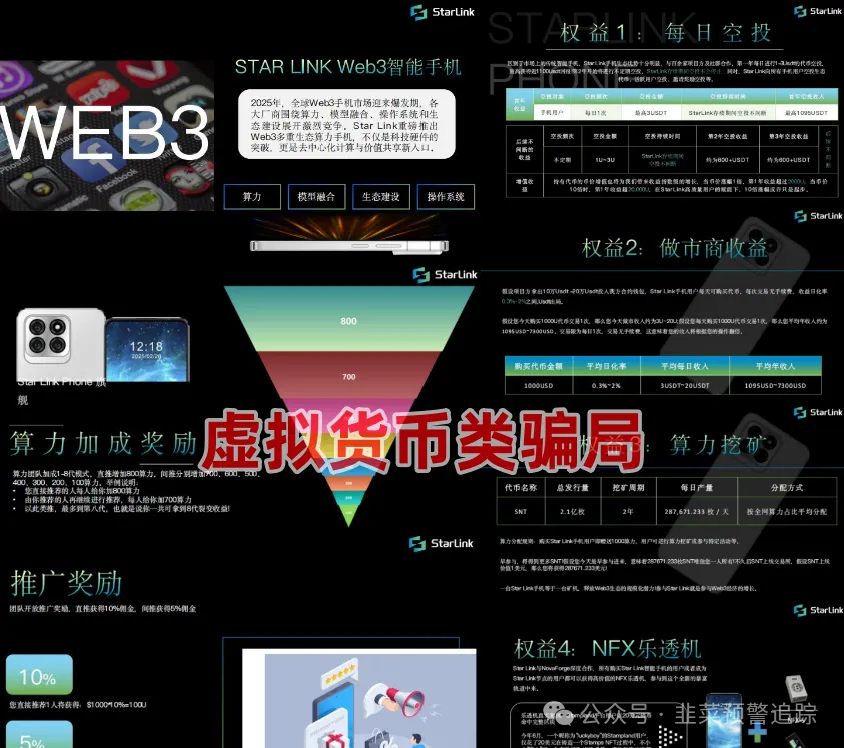 Star Link星链手机理财项目宣称是多重生态算力手机,参与可获四部分利润,包括每日空投收益、做市商收益、算力挖矿收益、NFX乐透机收益。其中做市商收益代币交易日收益率达0.3% - 2%,项目还涉及推广下线获直接、间接收益,涉嫌诈骗、洗钱、传销等违法行为。