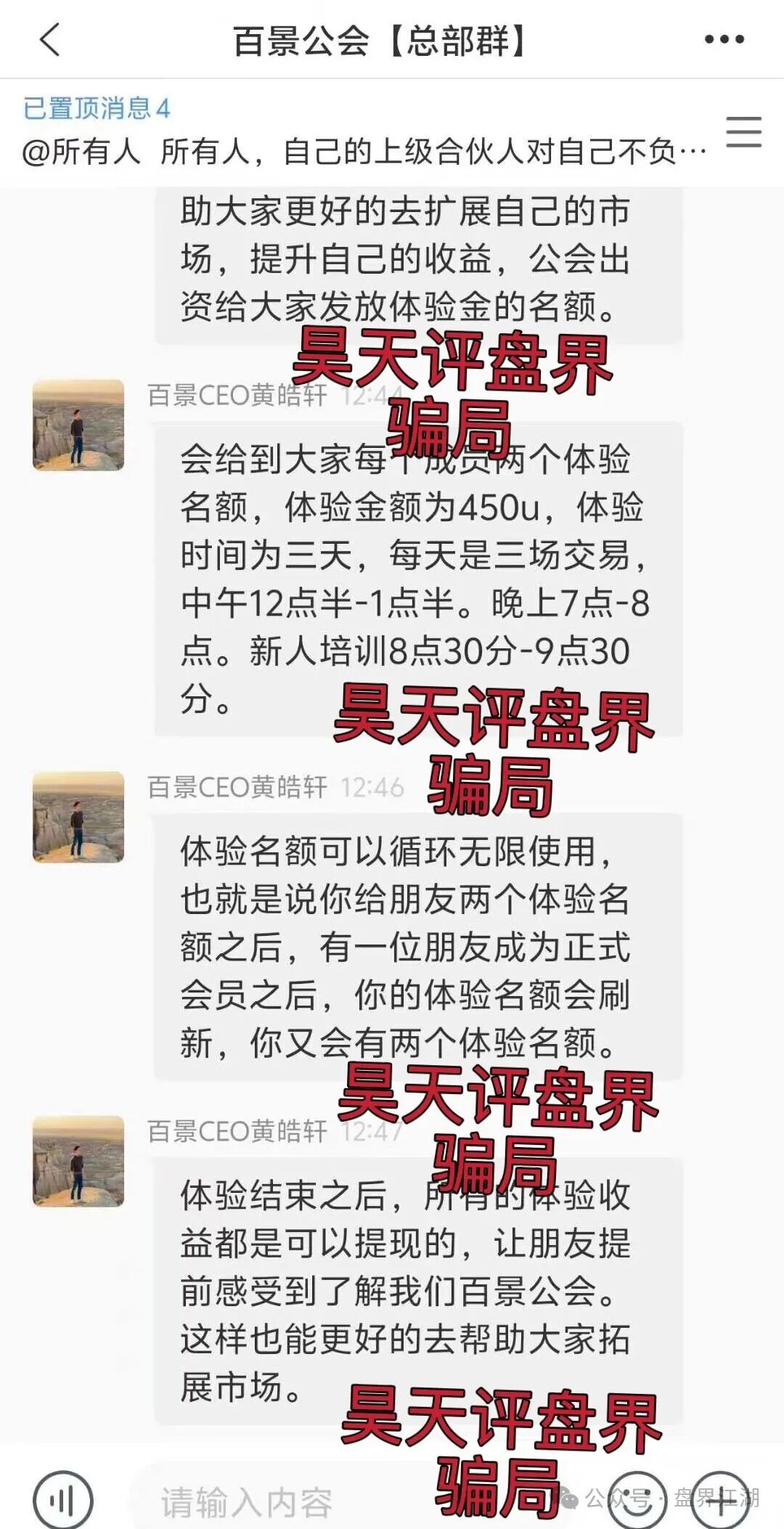 昊天评盘界:今天昊天带大家曝光一下一个叫百景公会的合约跟单类资金盘骗局,最新消息:之前“康卡斯特”诈骗团伙崩盘后开的盘,也4个月了,目前部分团队已经撤离,已经开始单割,高度预警,即将崩盘跑路!