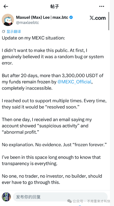 【抹茶MEXC交易所】陷入崩盘危机!爆雷!一用户21.8万枚ZEC被MEXC冻结无法提现,价值超过9000万美金!