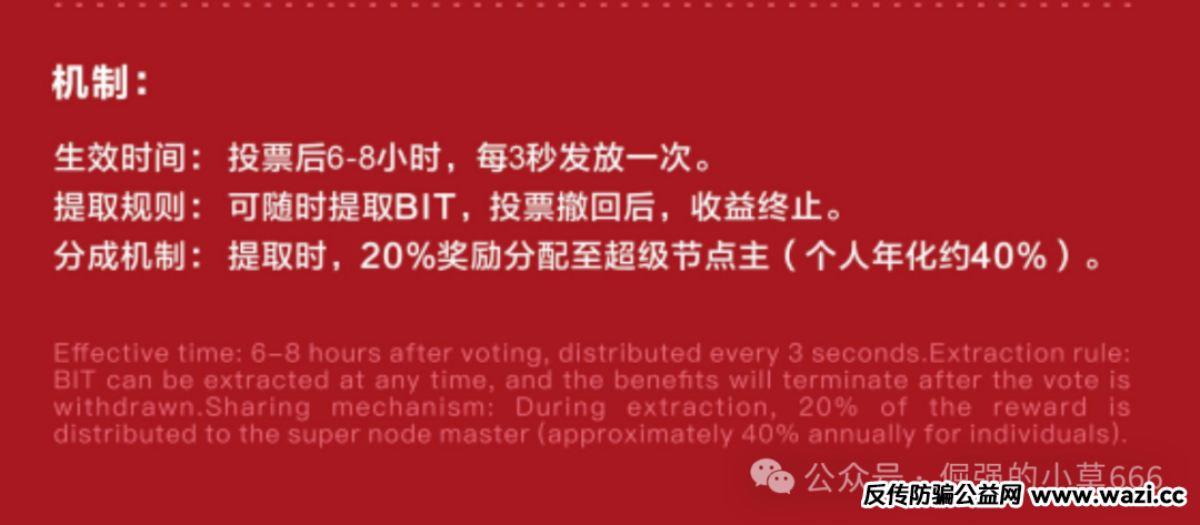 一是静态收益设计极具诱惑。用户需质押BIT代币,6至8小时后开始计息,收益每3秒发放一次,号称年化可达40%左右,且支持随存随取。但如此高频的收益发放,显然不符合正常金融逻辑,只能靠不断涌入的新资金维持。