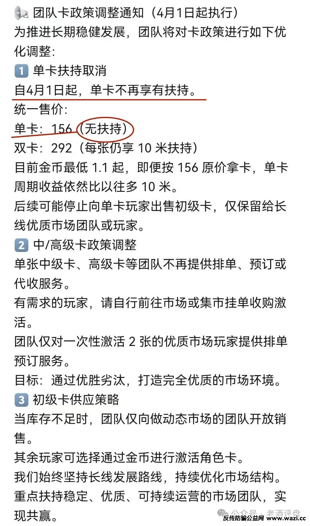 从社群公告来看,4月1日起取消单卡扶持,后续可能停止向单卡玩家出售初级卡,同时停止为中高级卡玩家提供排单、代收服务,仅保留给“优质团队”服务。这是资金盘崩盘前的典型操作:通过限制新散户入场,变相筛选出愿意大额投入的“优质玩家”接盘,同时逐步切断小额资金的通道,一旦新资金无法覆盖旧的兑付需求,项目方就会立刻关网跑路,而此时绝大多数散户的本金早已无法提现。