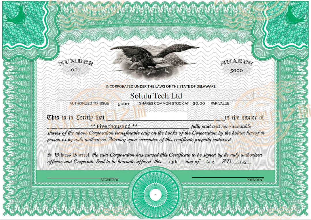 2》SOLULU项目资料介绍中,6个截图只有2个和“Solulu Tech Ltd”公司有关,一份股票证书中,空白处缺少持有人签名,且下方的秘书(Secretary)与总裁(President)处尚未签字,更无公章,法律上该证书未正式生效。