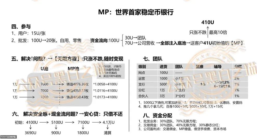 这个项目目前在境内社交群、境外社交群大量的传播与实际性展业,项目有三个部分组成,在PPT里面讲解显示,起源来自从事10多年全球移民行业的人员开始,建立了稳定币solulu基础(发行量10亿枚),还有BBS社区超级商学院。号称是全球首家稳定币银行。