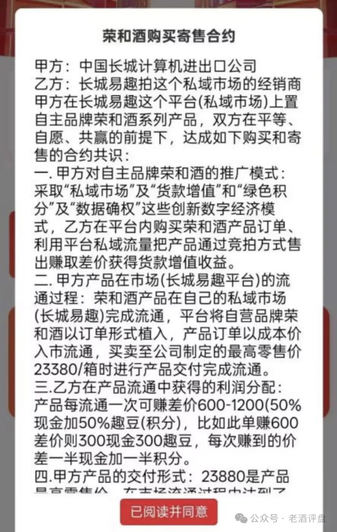 • 暴利诱惑:主打“白酒竞拍寄售”,宣称7天收益2%-4%,年化收益超200%,单箱酱酒标价23380元,营造“低投入、高回报、稳赚不赔”的神话。